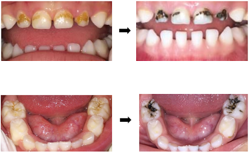 Tuy nhiên điểm hạn chế khi bôi SDF sẽ làm đổi màu răng thành màu đen. Nhưng mà những vùng mô răng không bị mất khoáng thì sẽ không bị đổi màu. Khi bôi SDF xong dù răng có biến đổi thành màu đen nhưng không làm ảnh hưởng gì đến răng vĩnh viễn sau này.